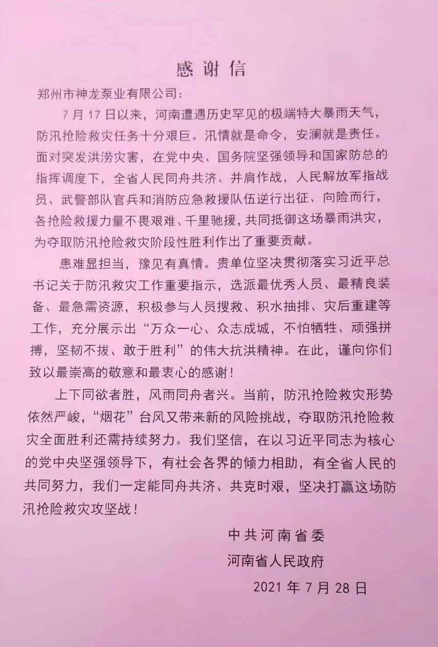 河南省人民政府发来感谢信